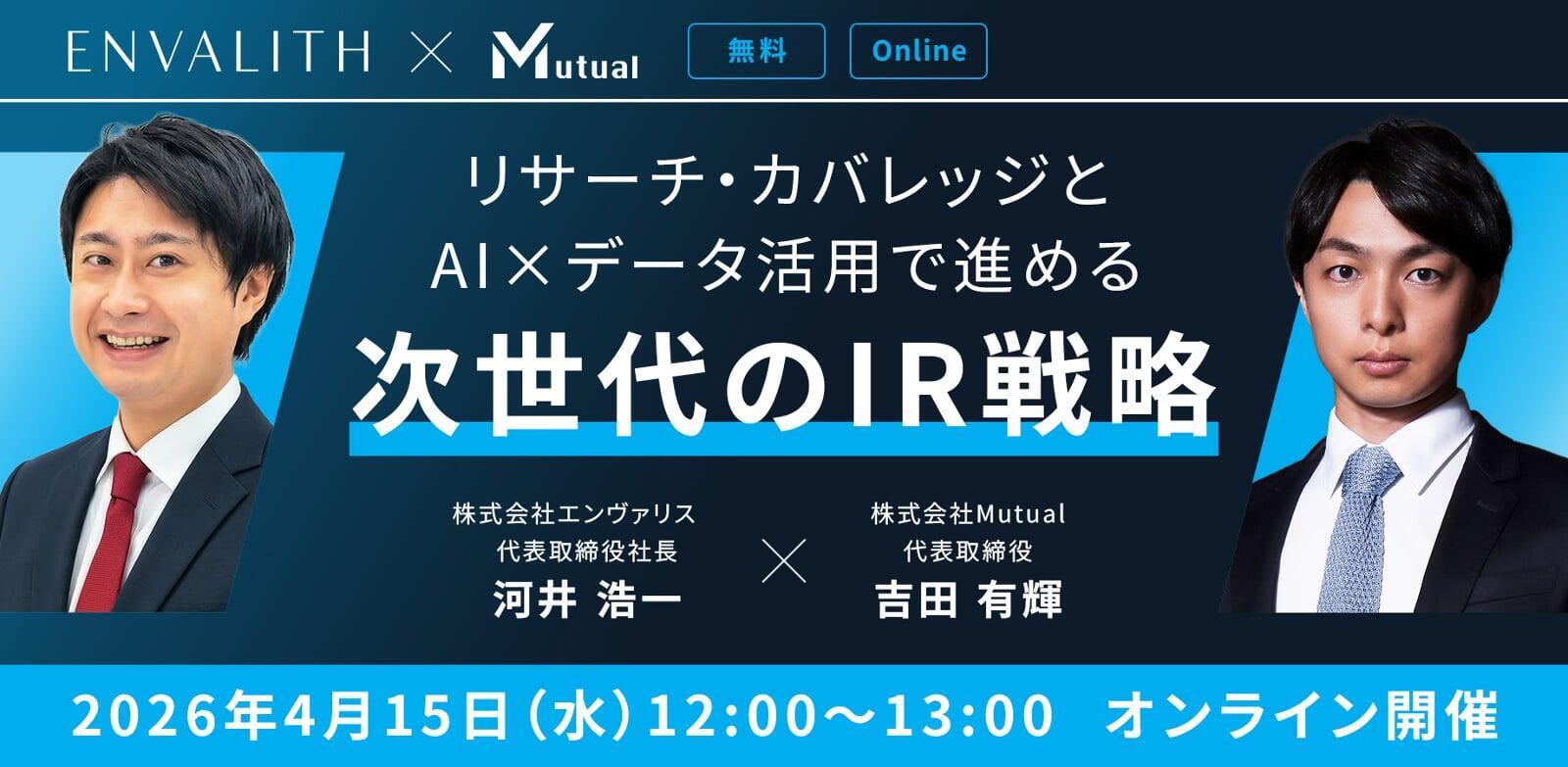 株式会社Mutualからは対話情報のデータ活用によるIR活動の質向上について、株式会社エンヴァリスからはリサーチ・カバレッジを通じた投資家への情報発信の重要性について解説します。